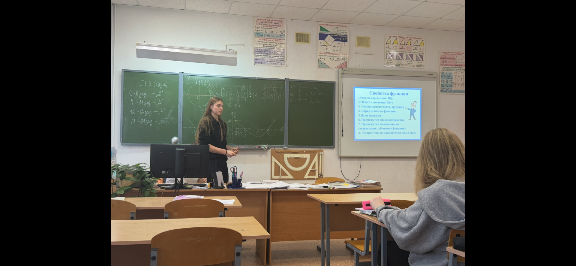 В ходе урока обучающиеся 11 «В» Береснева Виктория и Пшеницына Екатерина помогли одноклассникам научиться строить график функции косинус, записывать ее свойства.
