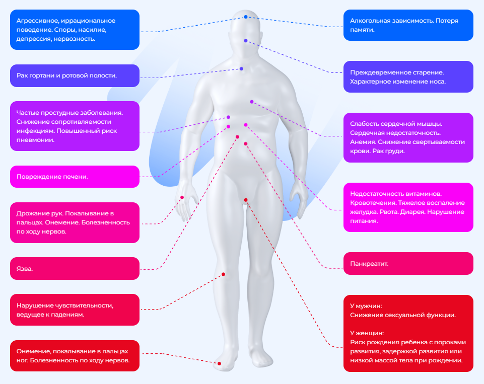 Употребление алкоголя является причиной более чем 200 заболеваний, травм, а также других нарушений здоровья. Алкоголь увеличивает риск развития сердечно-сосудистых заболеваний, злокачественных новообразований, заболеваний пищеварительной системы, вызывает психические и поведенческие нарушения.
