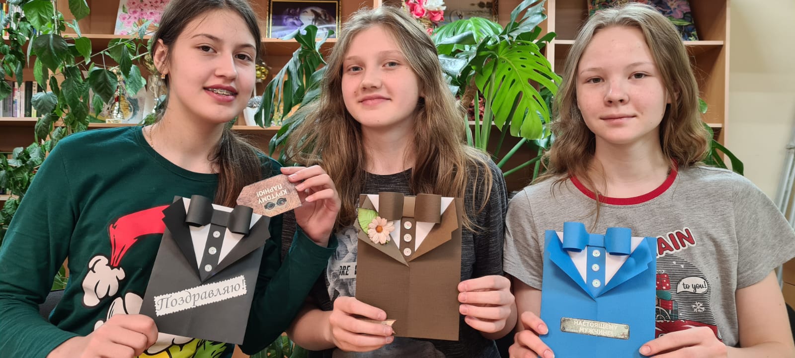 Девушки приготовили поздравительные открытки для своих пап, дедушек и братьев.