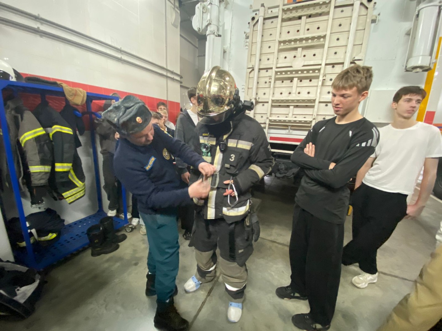 В ходе экскурсии спортсмены ознакомились с внутренним устройством части, узнали о назначении пожарных машин и особенностях работы спасателей. Особое внимание уделялось практическим навыкам: учащиеся самостоятельно примеряли спецодежду пожарного и обучались правильному её использованию.