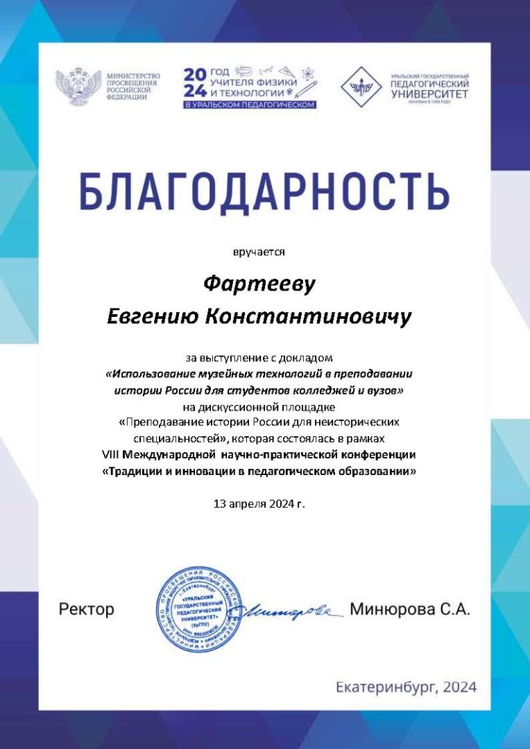 Участие с докладом в данной конференции принял преподаватель истории Фартеев Евгений Константинович. Евгений Константинович выступил на дискуссионной площадке «Преподавание истории для неисторических специальностей». В своем докладе преподаватель поделился собственным опытом применения музейных технологий в рамках преподавания курса истории студентам училища.