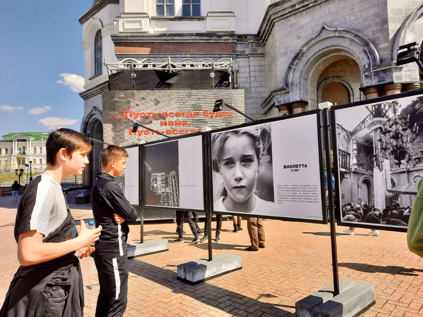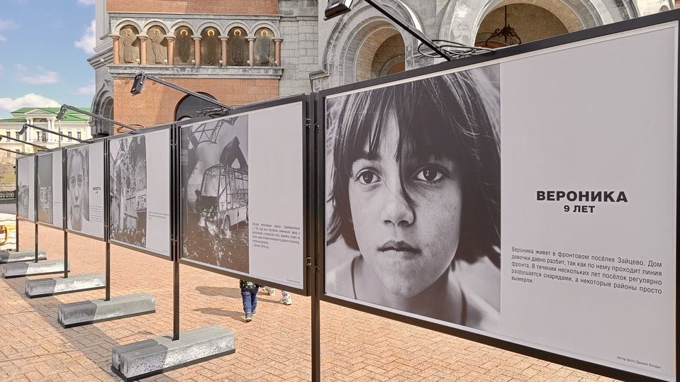 «Пусть всегда будет мама, пусть всегда буду я!» – этими строчками открывается выставочный проект, в рамках которого представлены фотографии 25 детей, годами живших под бомбежками на территории ДНР и ЛНР. Также на стендах размещены снимки территорий, попавших под обстрел.