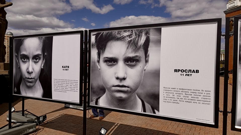 На каждом стенде представлены фотография и история ребенка, живущего под постоянными обстрелами. Некоторые из этих детей родились после 2014 года и никогда не видели мирного неба над головой. Девочки и мальчики Донбасса рассказывали журналистам, как они живут, учатся прятаться от снарядов и по звуку различают калибры использованных боеприпасов.