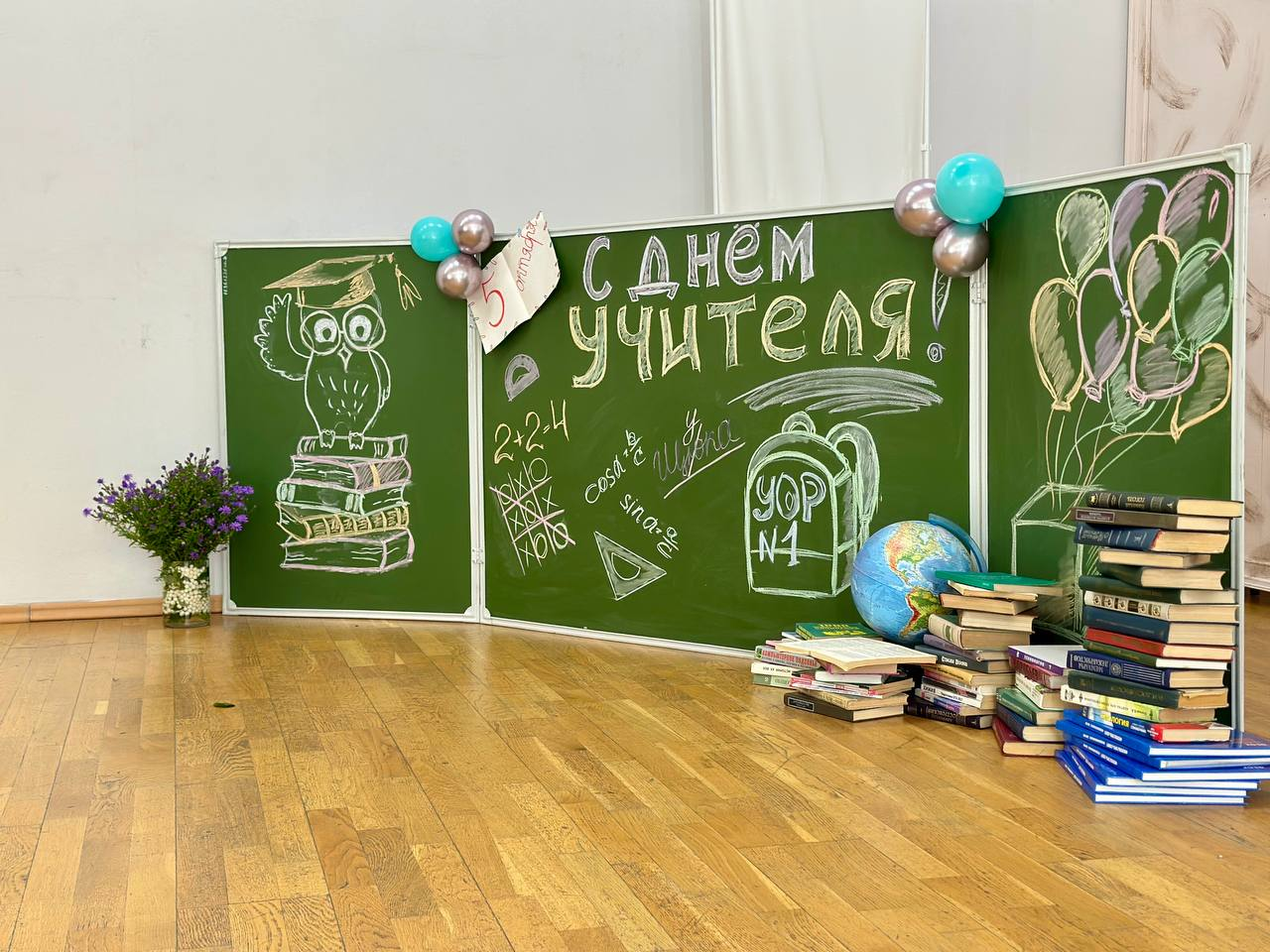 Обучающиеся также проявили творческую инициативу, украсив праздничную зону своими руками. Школьная доска, ставшая основой декора, превратилась в настоящее произведение искусства, украшенное изумительными рисунками, посвященными Дню учителя.
