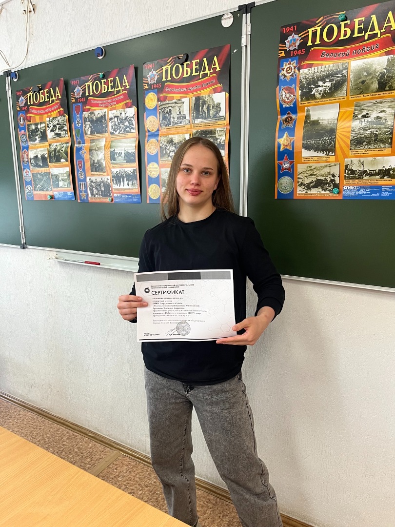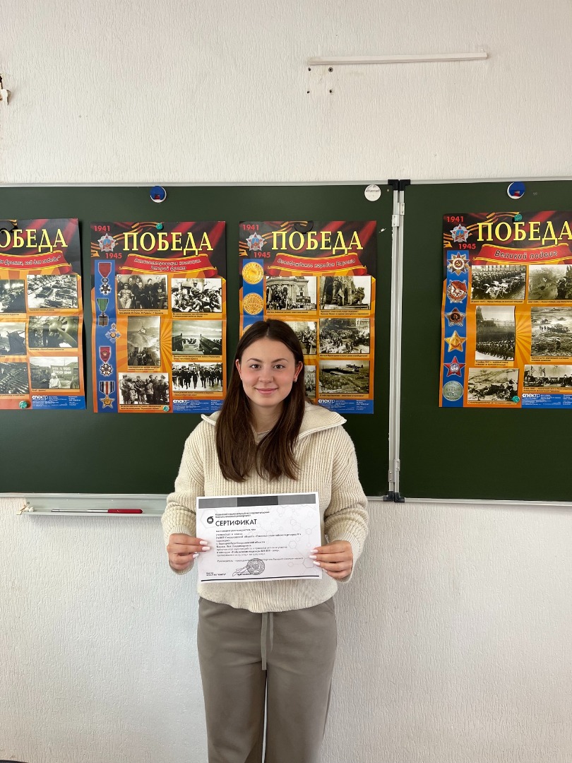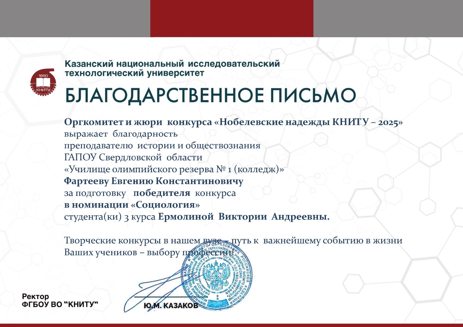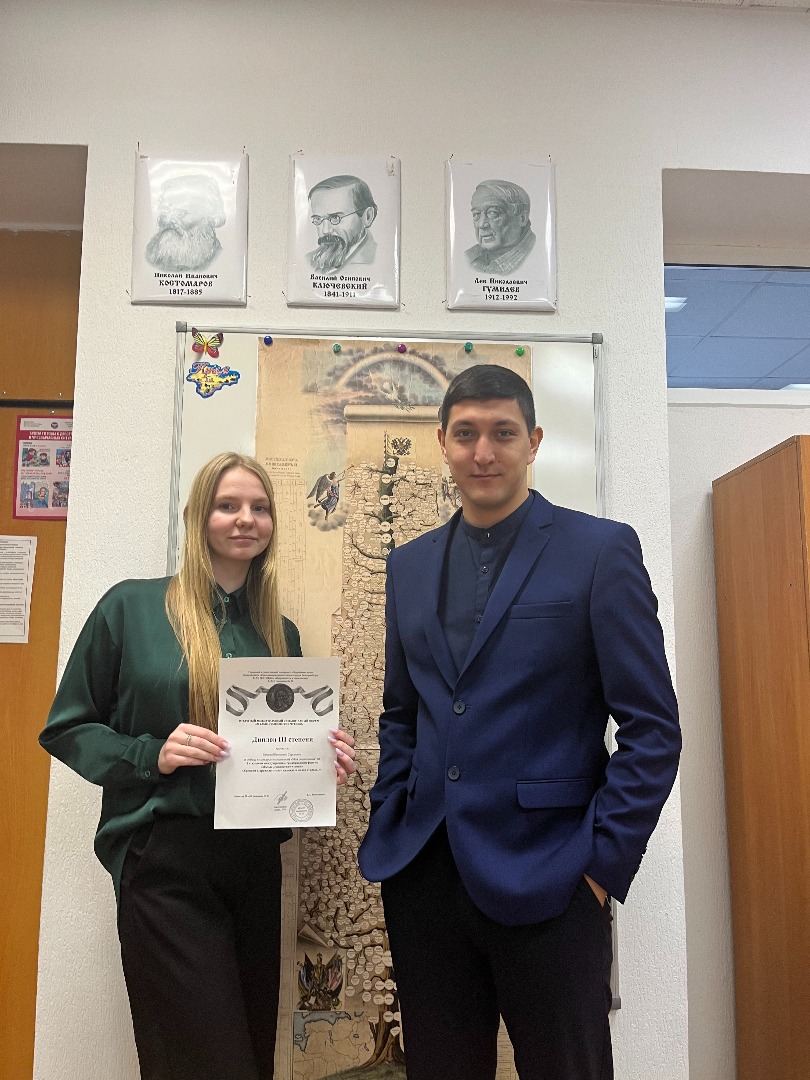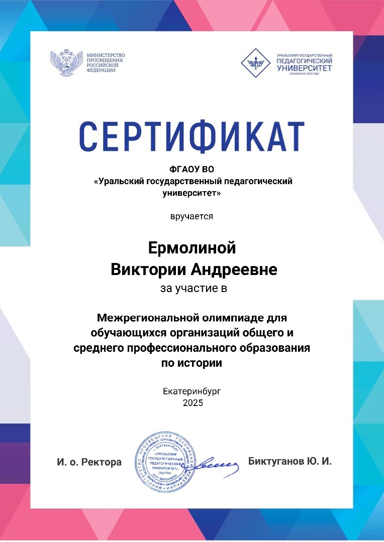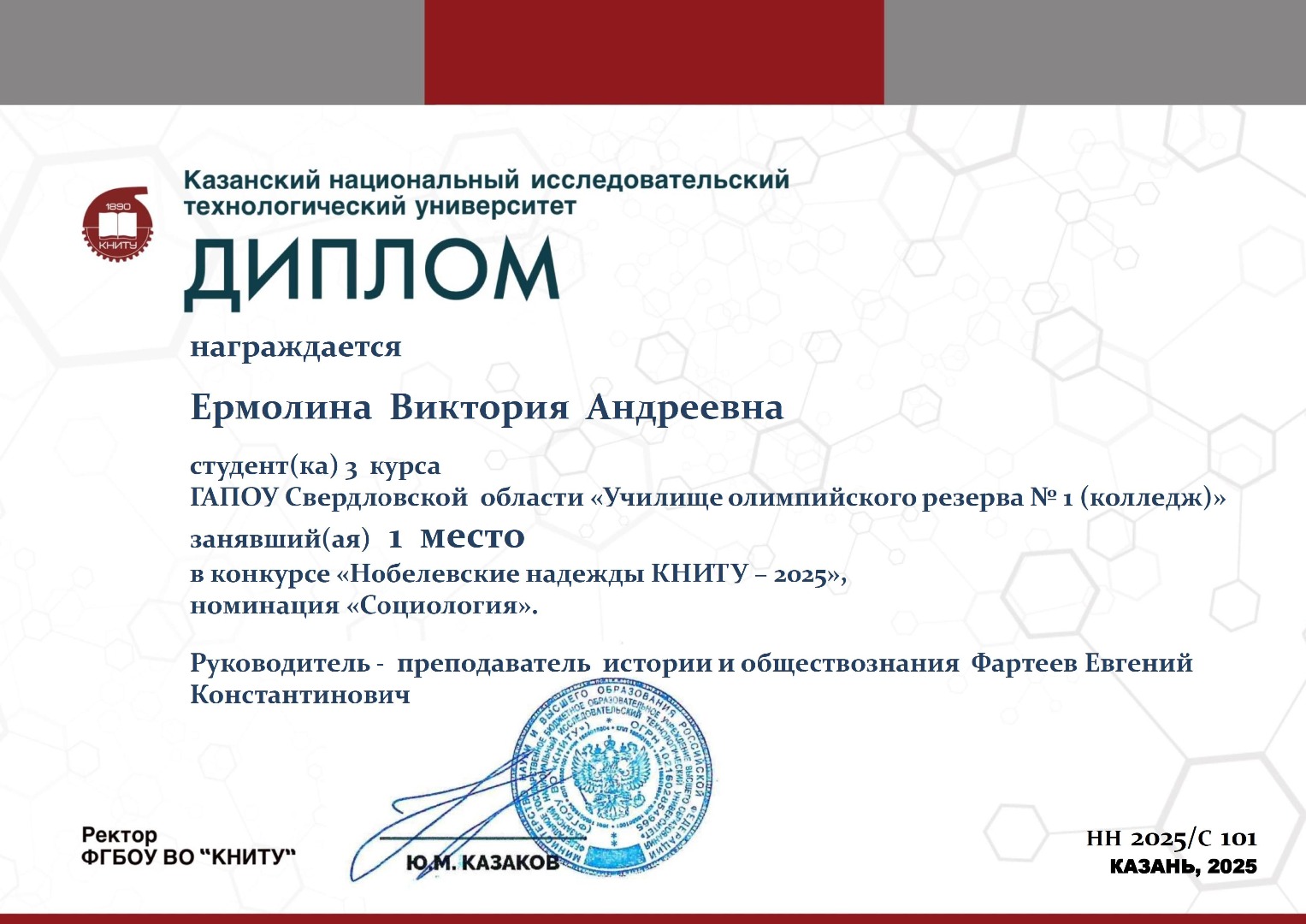 Студентка третьего курса Ермолина Виктория стала участницей Межрегиональной олимпиады по истории для обучающихся организаций общего и среднего профессионального образования проводившейся Уральским государственным педагогическим университетом. Кроме того, Виктория со своей темой исследования «Значение спорта в социализации личности» в номинации «Социология» стала победителем XVIII конкурса научно-исследовательских и творческих работ «Нобелевские надежды КНИТУ – 2025».