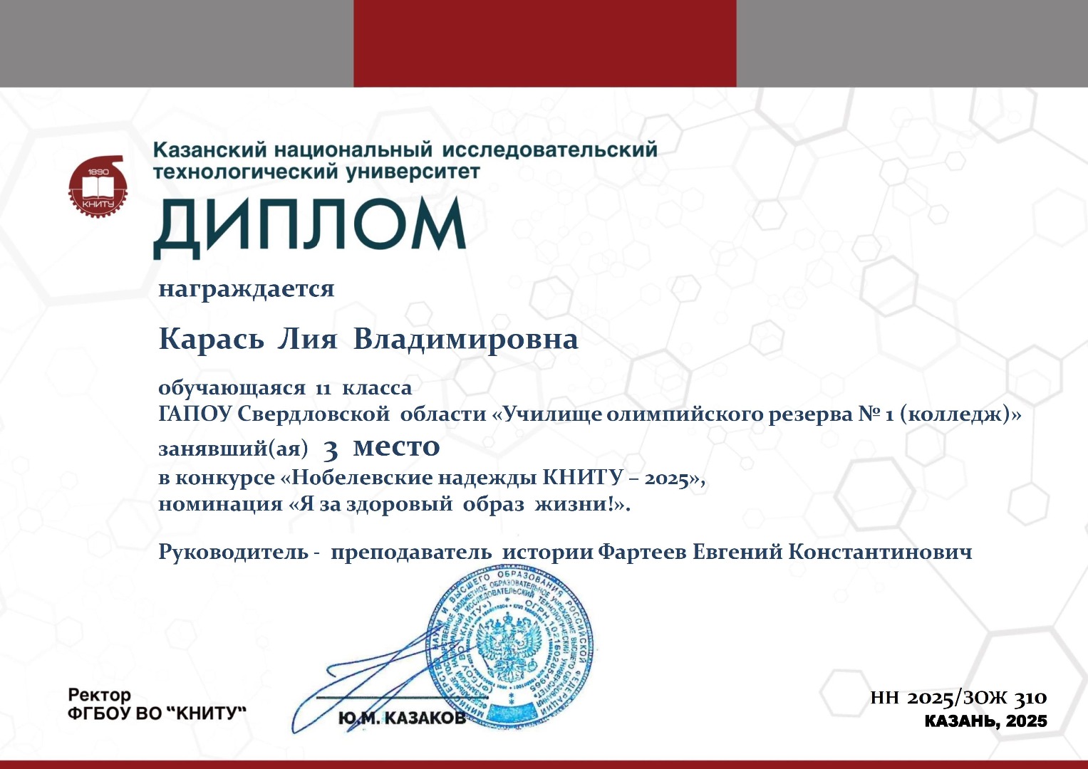 Обучающаяся 11 «Г» класса Карась Лия со своей темой исследования: «Основы здорового питания спортсмена» прошла не только отборочный этап, но и стала призером III степени в номинации «Я за здоровый образ жизни!» XVIII конкурса научно-исследовательских и творческих работ «Нобелевские надежды КНИТУ – 2025».