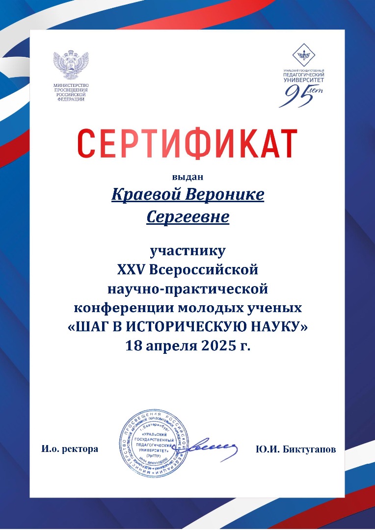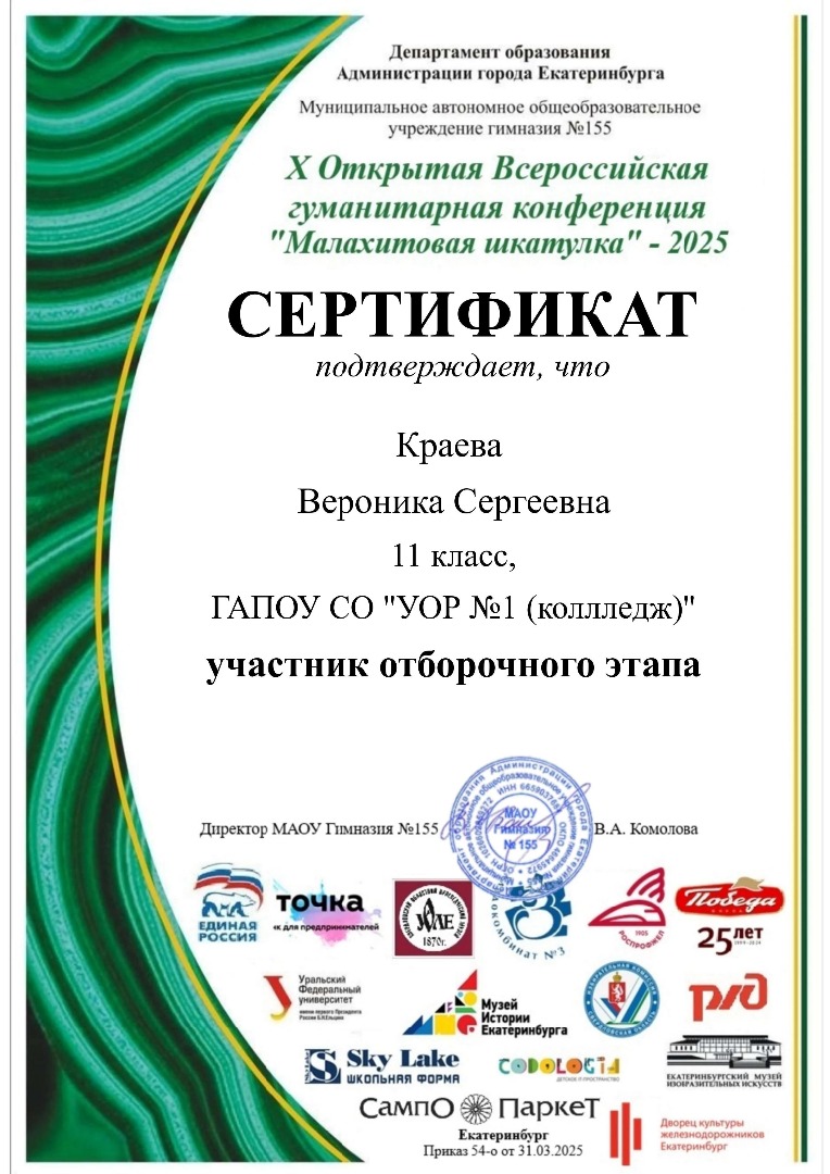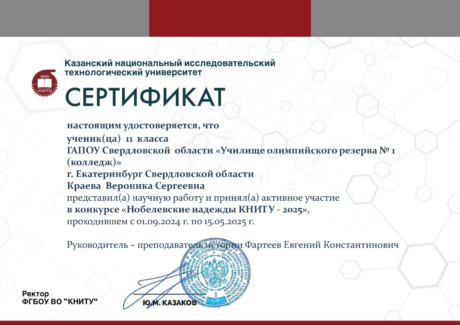 Обучающаяся 11 «Г» класса Краева Вероника со своей темой исследования: «Фронтовики-олимпийцы Урала» стала участницей сразу нескольких конкурсов. Проект Вероники прошел экспертную комиссию в отборочном этапе X Открытой гуманитарной конференции «Малахитовая шкатулка», которая проводится для обучающихся образовательных организаций города Екатеринбург и области. Также Вероника выступила со своим докладом на XXV Всероссийской научно-практической конференции «Шаг в историческую науку» проходившей в Уральском государственном педагогическом университете. Кроме того, Вероника стала участницей XVIII конкурса научно-исследовательских и творческих работ «Нобелевские надежды КНИТУ – 2025».