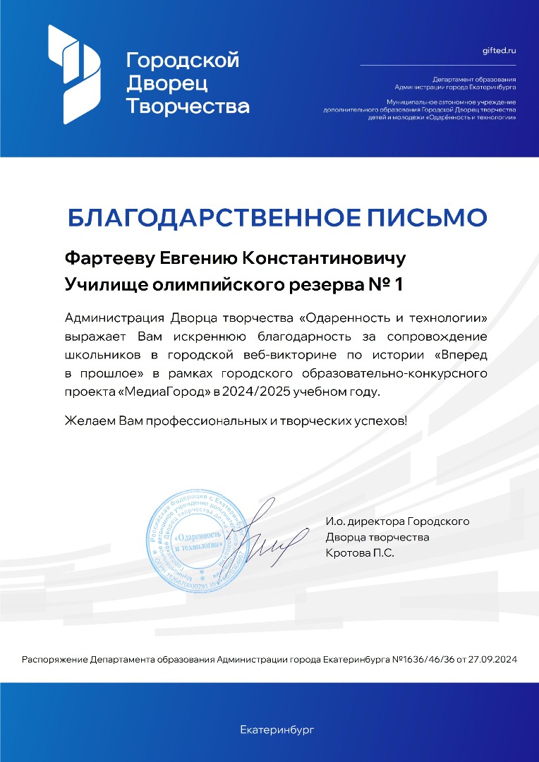Весной 2025 года обучающиеся Училища олимпийского резерва №1 (колледж) под руководством учителя истории и обществознания Фартеева Евгения Константиновича принимали активное участие в городских и всероссийских научно-исследовательских конкурсах, и олимпиадах.