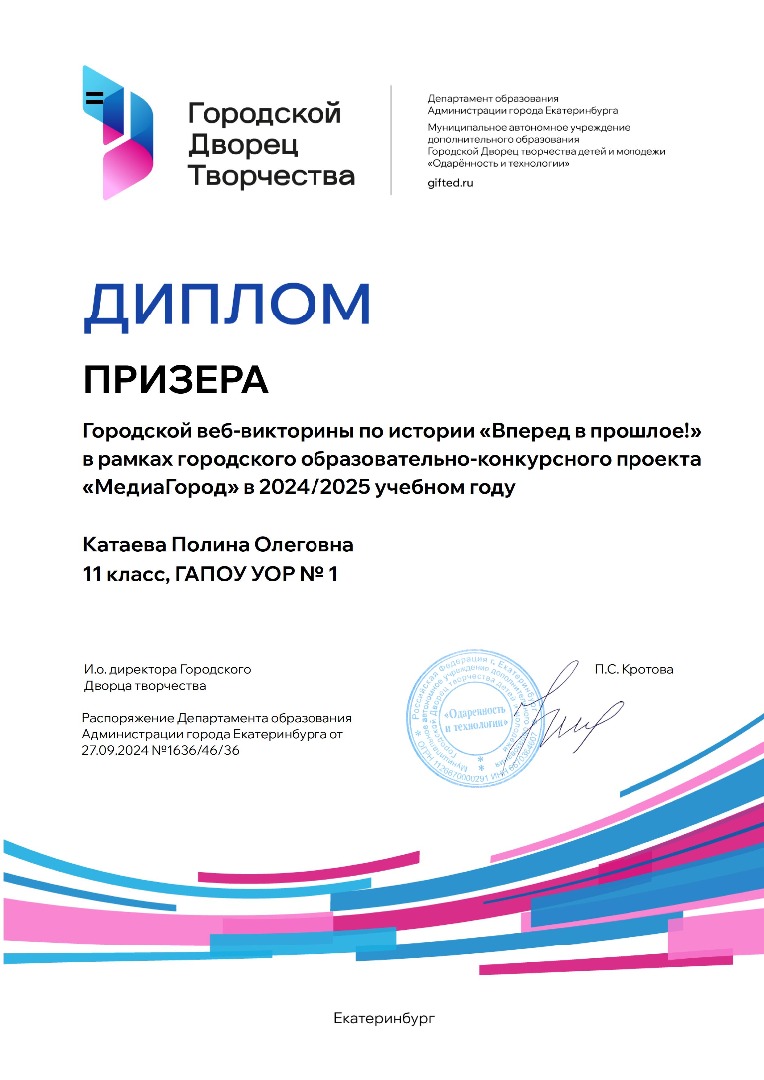 Обучающаяся 11 «В» класса Катаева Полина стала призером Городской веб-викторины по истории «Вперед в прошлое!» в рамках городского образовательно-конкурсного проекта «МедиаГород».