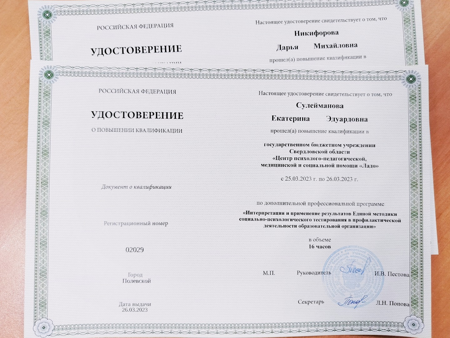 25-26.03.2023 педагоги-психологи: Никифорова Д.М., Сулейманова Е.Э. прошли Курс повышения квалификации «Интерпретация и применение результатов Единой методики социально-психологического тестирования в профилактической деятельности организации». Курсы проходили на базе ГБУ СО «ЦППМИСП «Ладо».