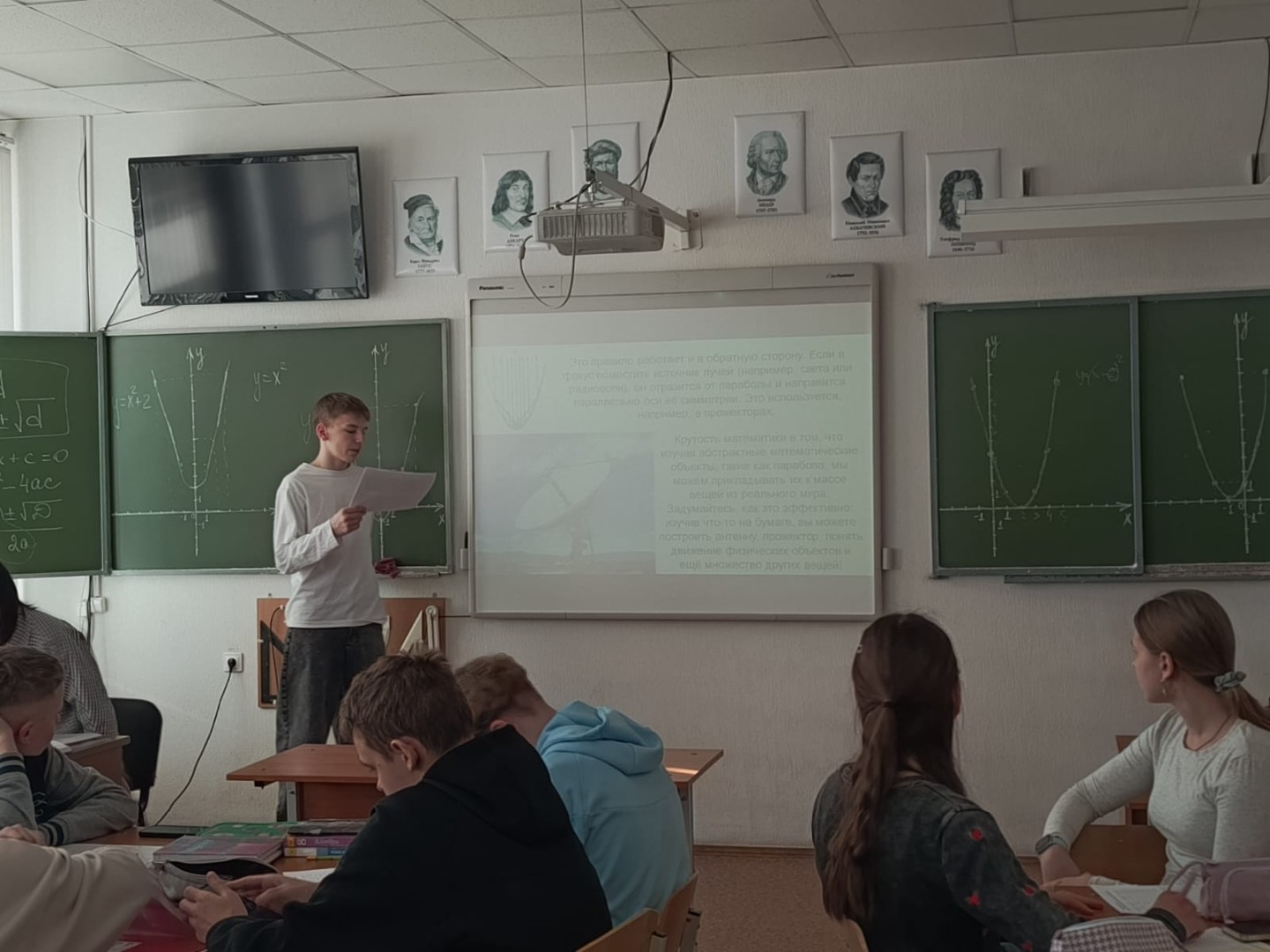В заключительной части урока выступил Рямбов Илья с презентацией на тему «Зачем и почему мы изучаем параболу?». Он рассказал о применении параболы и ее свойствах в различных областях, таких как наука, архитектура и баллистика, а также о том, как парабола встречается в природе и повседневной жизни.
