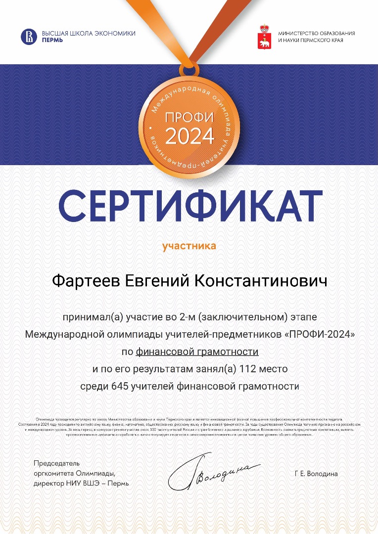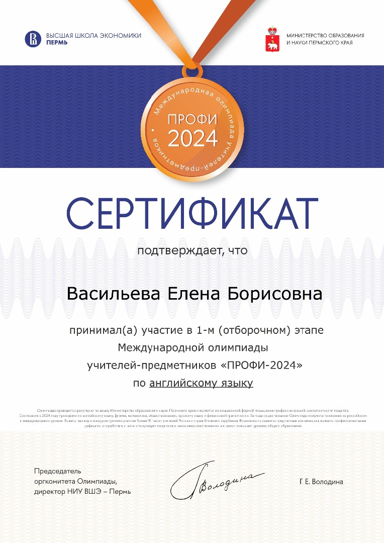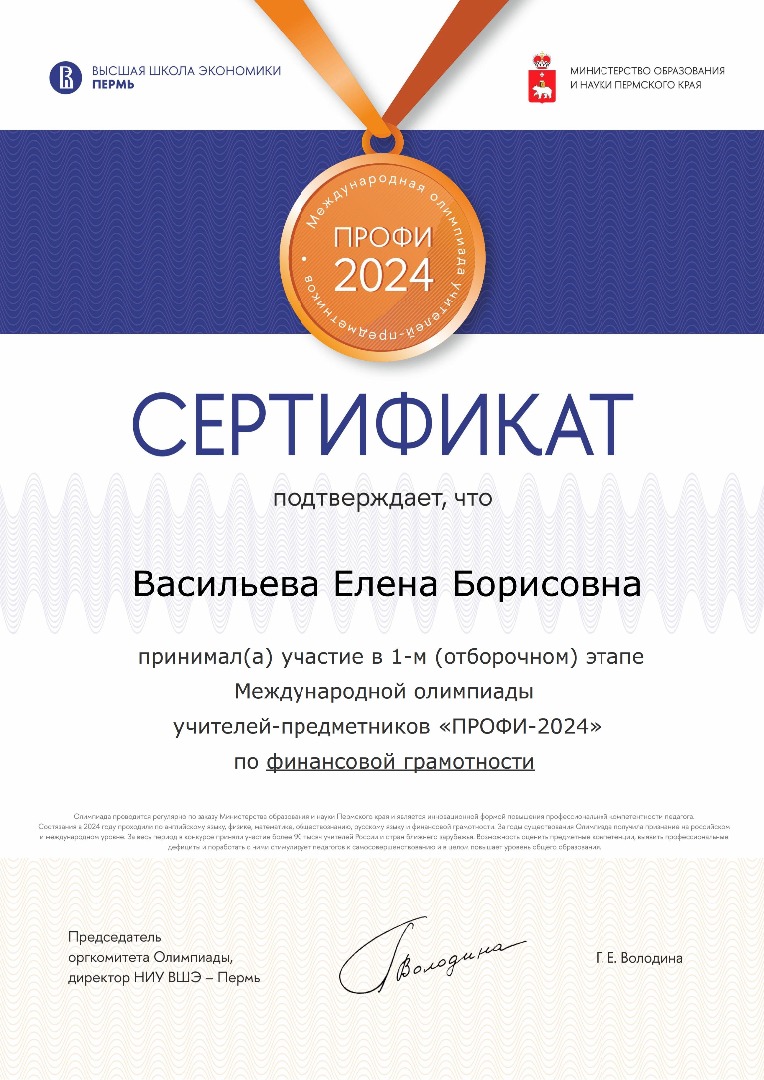 Учитель английского языка, Елена Борисовна участвует второй год подряд и в этом году она попробовала свои силы в олимпиаде по английскому языку и финансовой грамотности. Елена Борисовна прошла в заключительный тур олимпиады по финансовой грамотности.