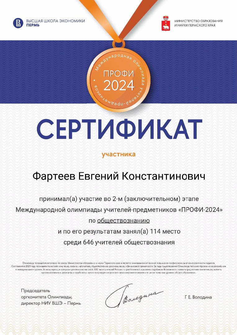 Учителя методического объединения гуманитарного цикла Васильева Е.Б и Фартеев Е.К. в октябре-ноябре 2024 года принимали участие в XVII Международной олимпиаде учителей-предметников «ПРОФИ-2024».
