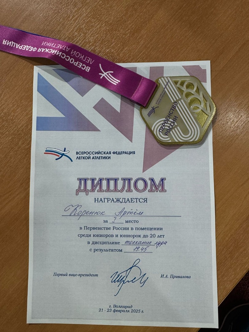 КОРЕНЮК АРТЕМ одержал победу в толкании ядра весом 6 кг, показав результат 19 м 45 см. Он также выполнил норматив Мастера спорта России и занял впечатляющее 3 место в мировом рейтинге среди юниоров. Это потрясающее достижение!