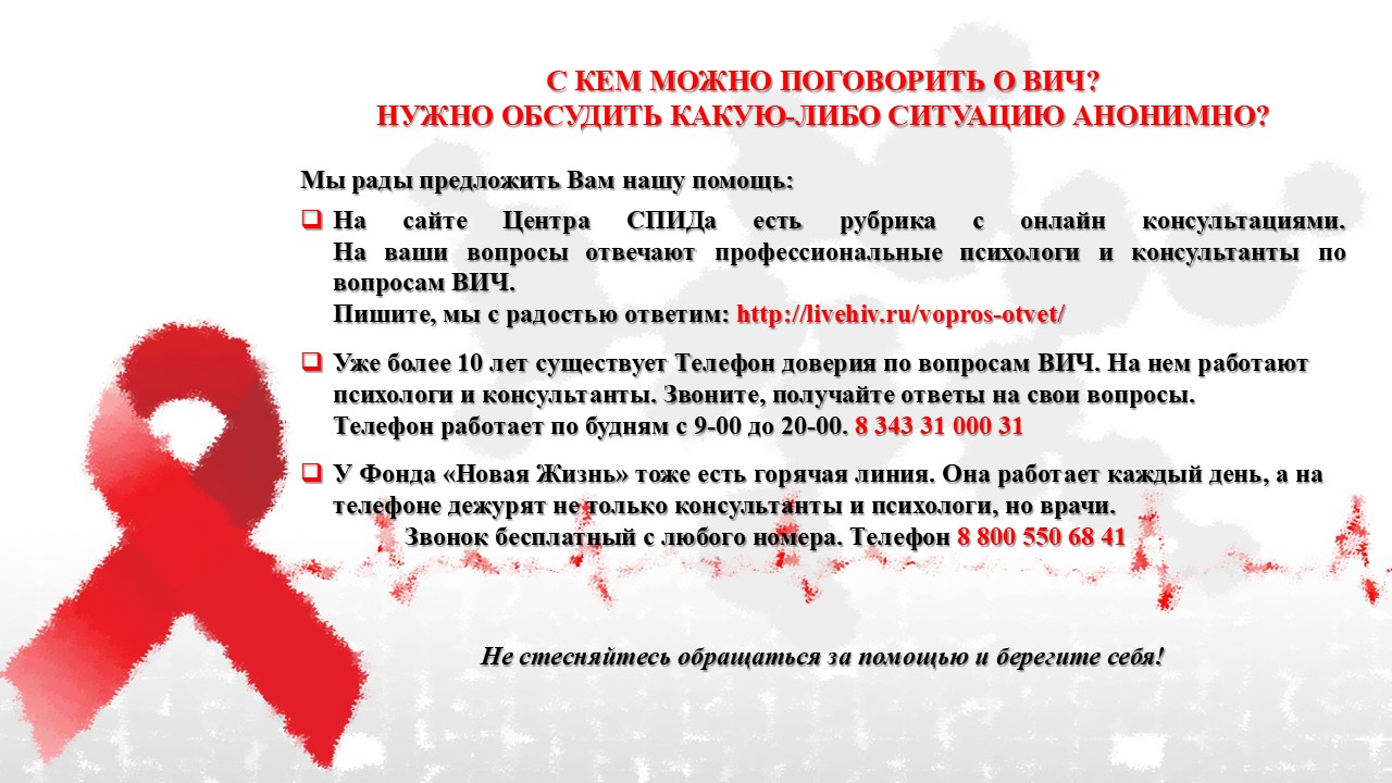 Сайт центра СПИДа (контакты, новости, рубрика “Вопрос-ответ” и др: https://livehiv.ru/